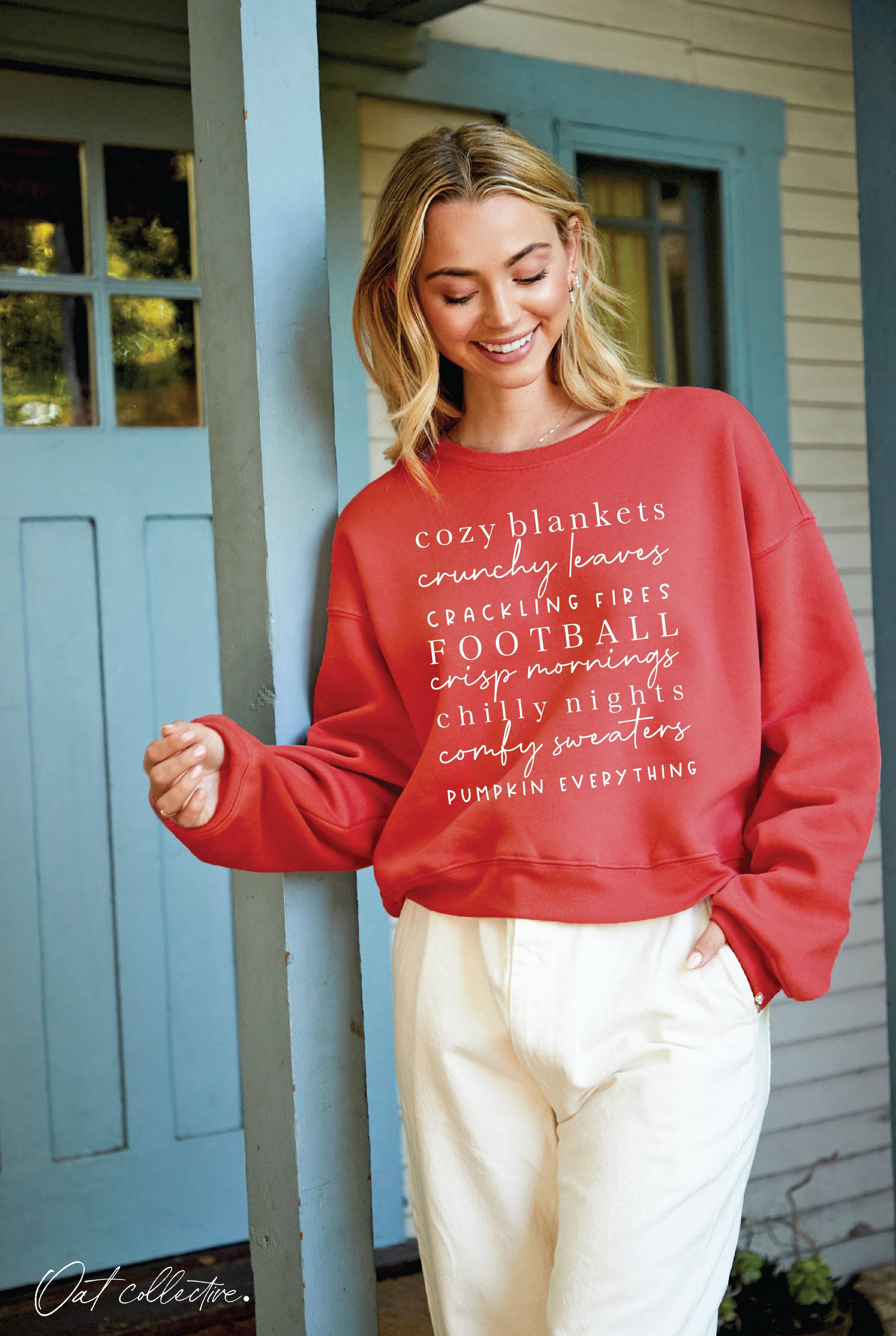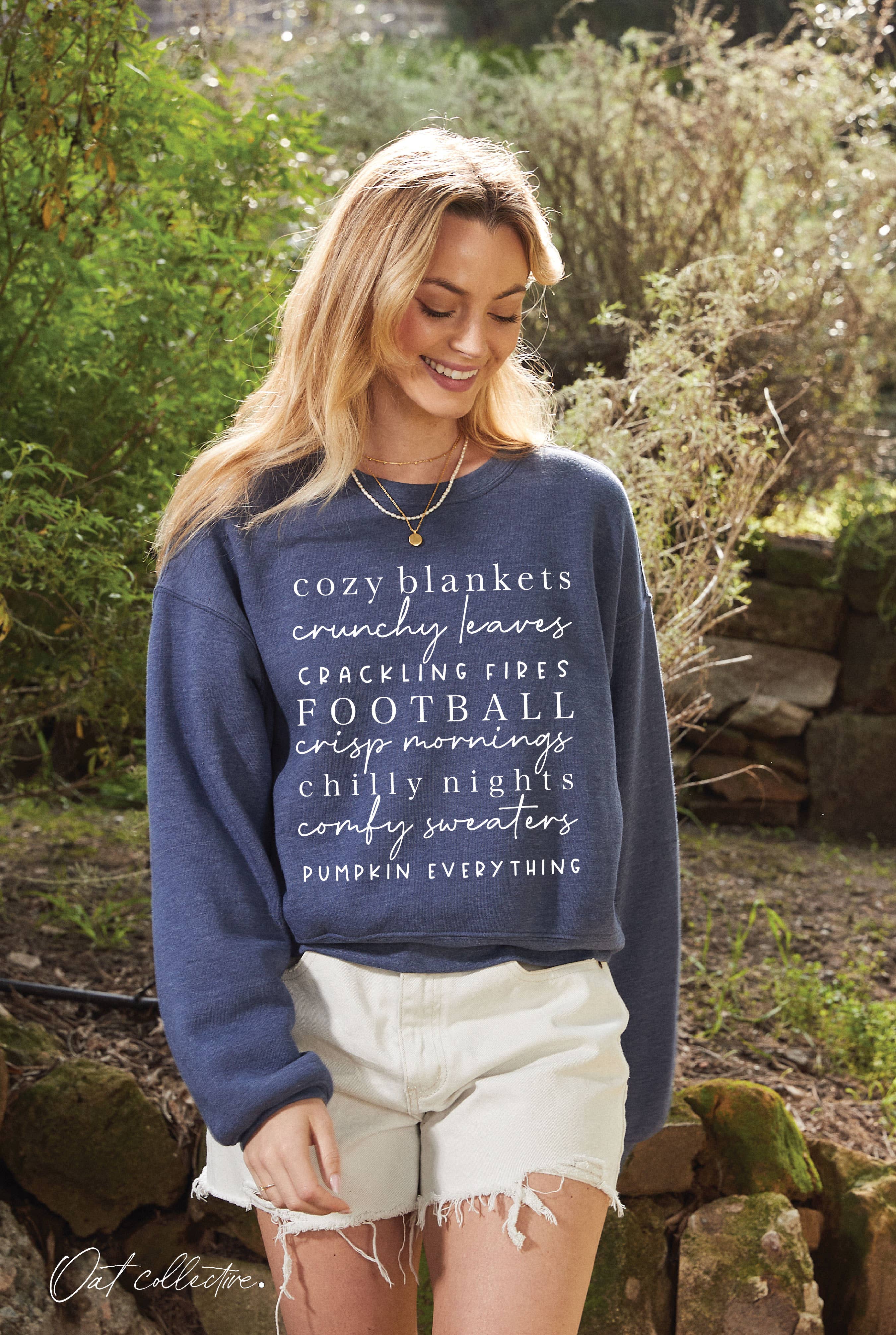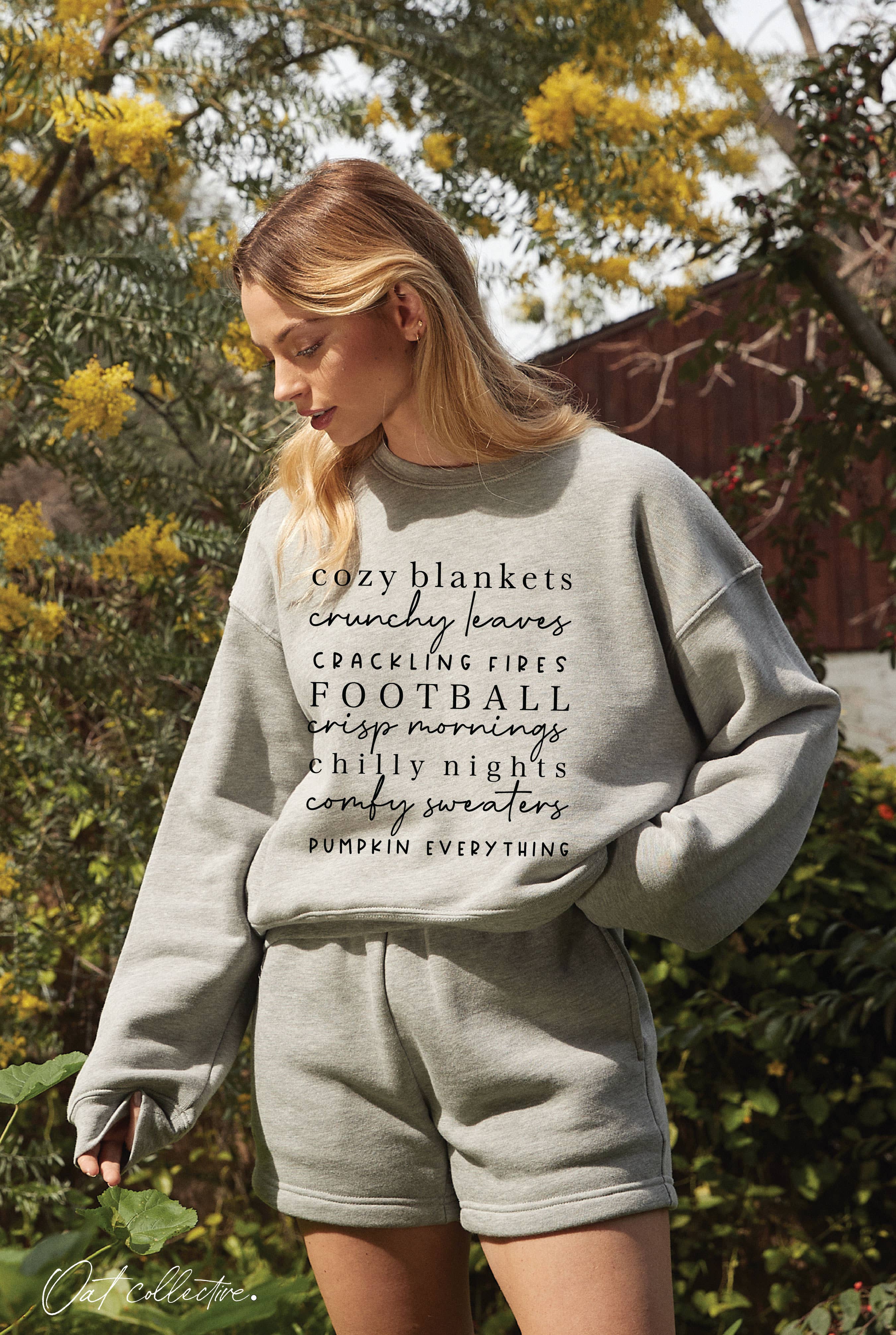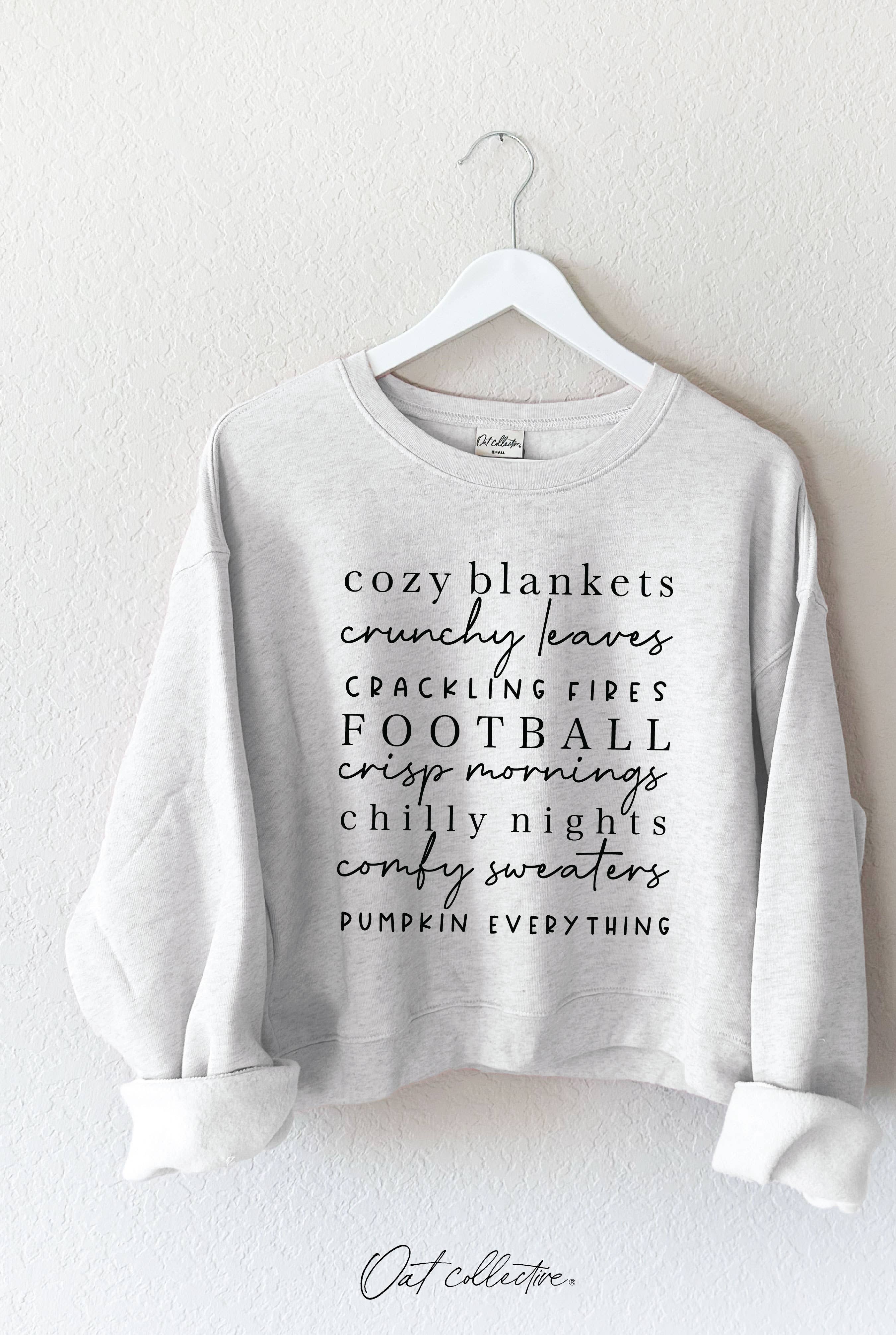 COZY BLANKETS CRUNCHY LEAVES CRACKLING FIRES FOOTBALL CRISP MORNINGS CHILLY NIGHTS COMFY SWEATERS PUMPKIN EVERYTHING Mid length Graphic Fleece Pullover Relaxed Fit.