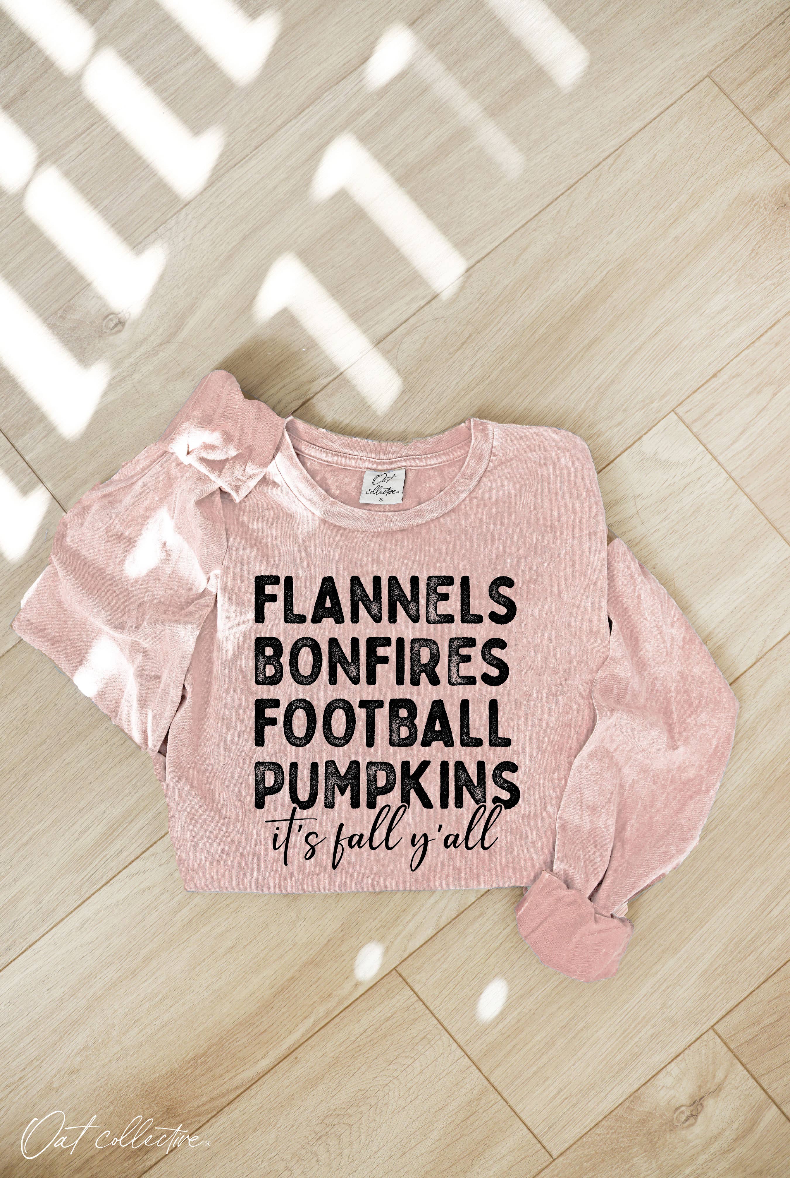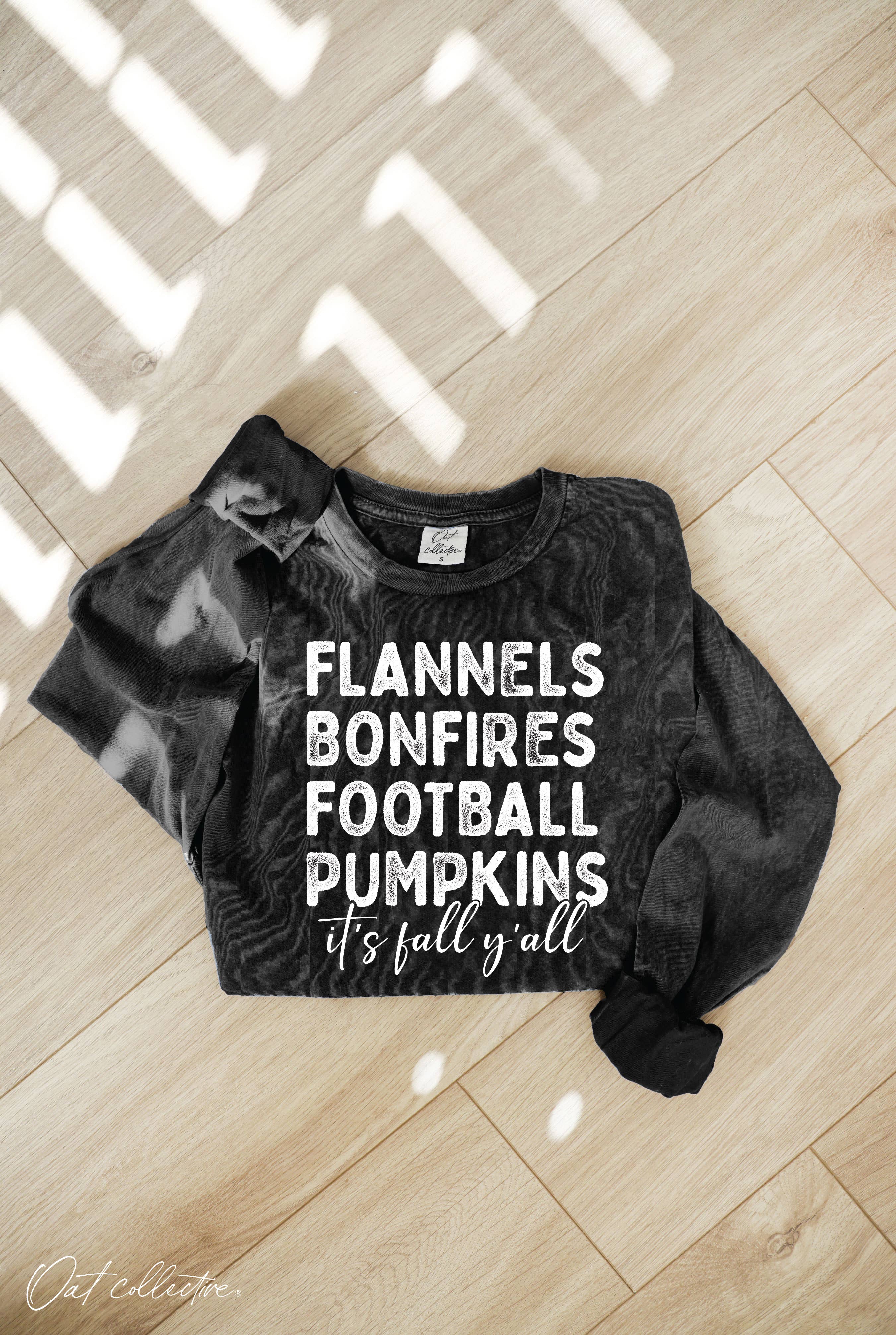 FLANNELS BONFIRES FOOTBALL PUMPKINS IT'S FALL Y'ALL Mineral Washed Long Sleeve Graphic Top