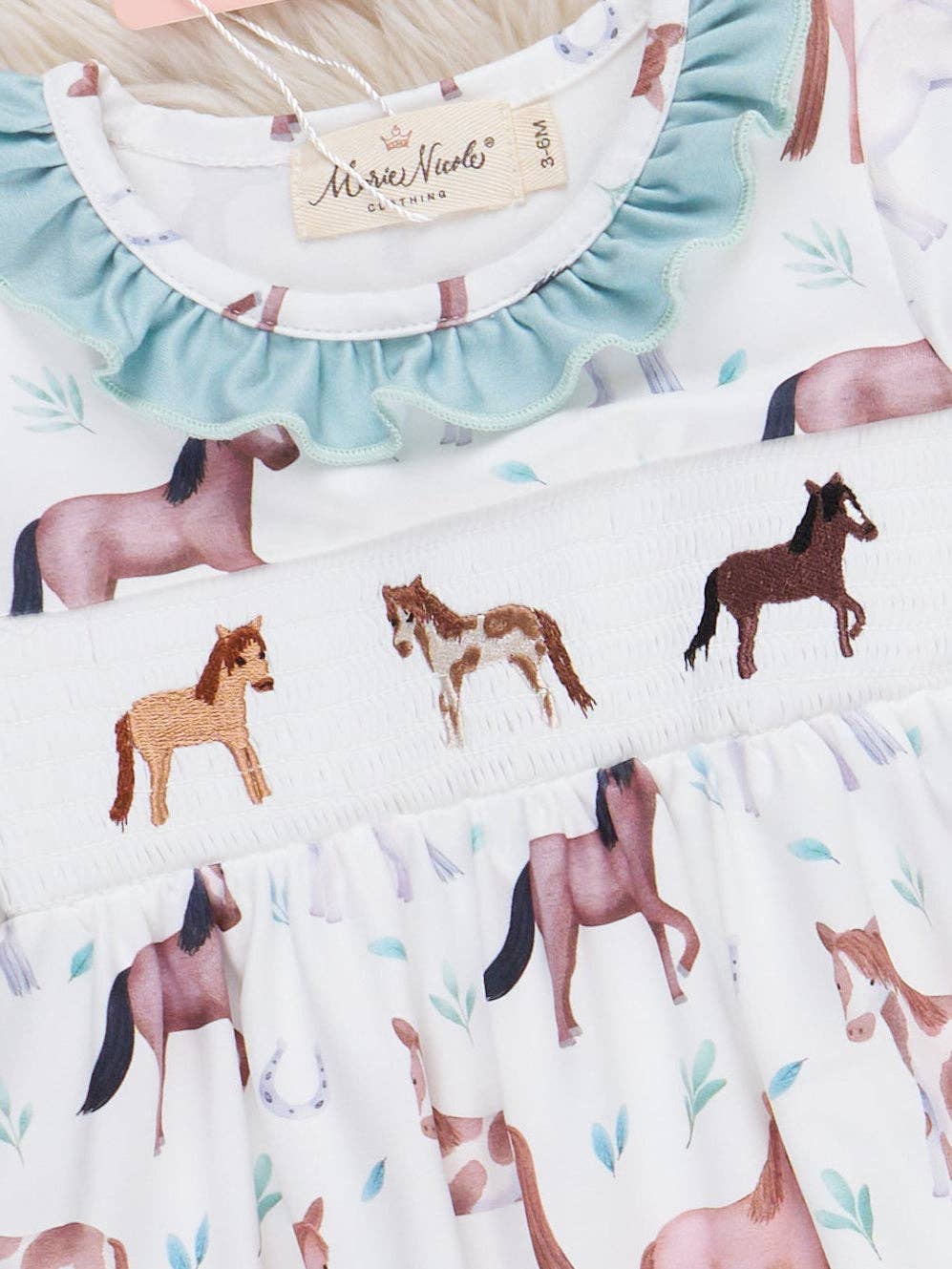 The Little Wrangler Gown by Marie Nicole Clothing features a playful farm horse print and charming gathered hem, perfect for little wranglers. Made with soft fabric and gentle cuffs, this gown offers comfort and western-inspired style for restful days and nights.
